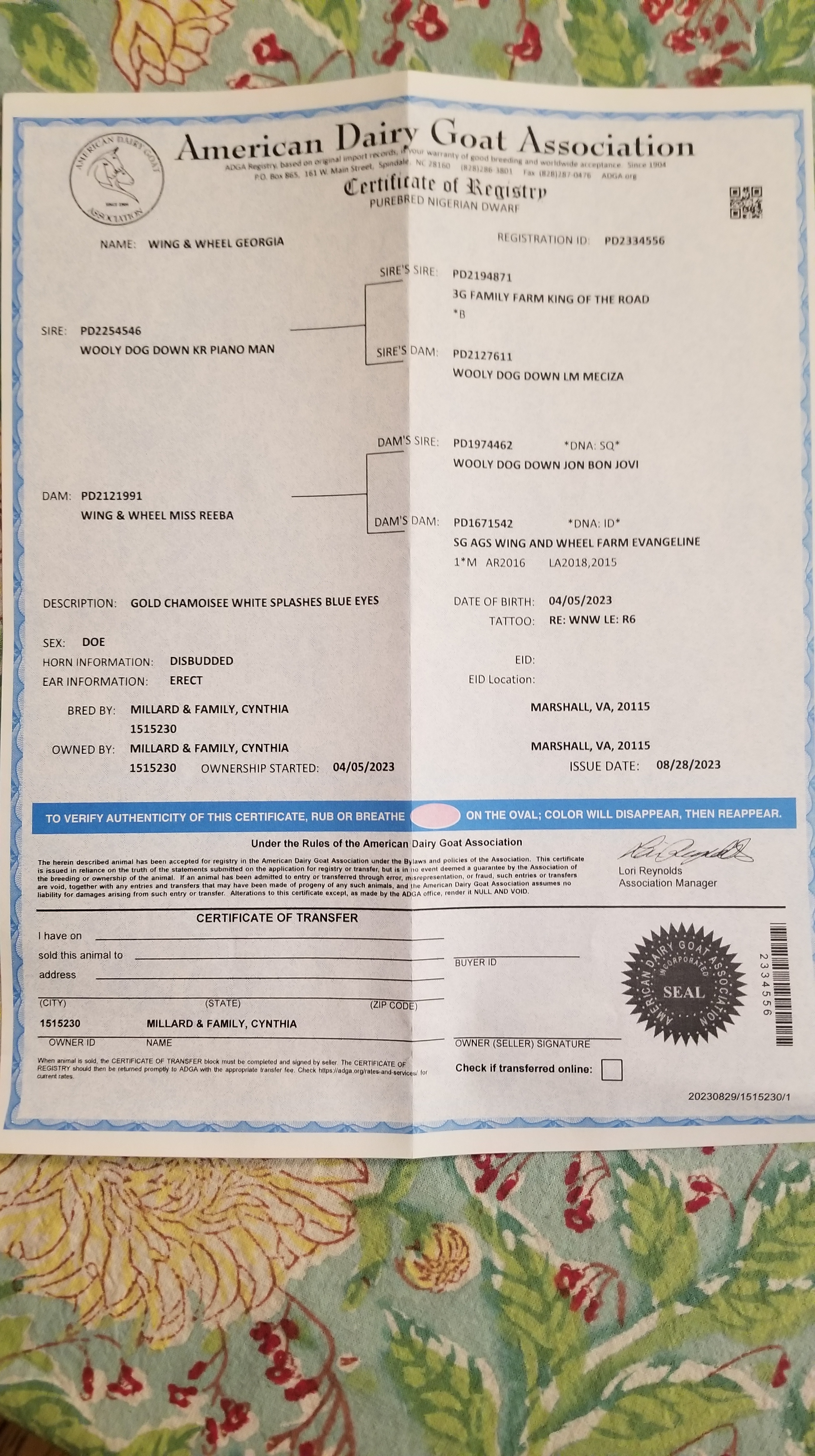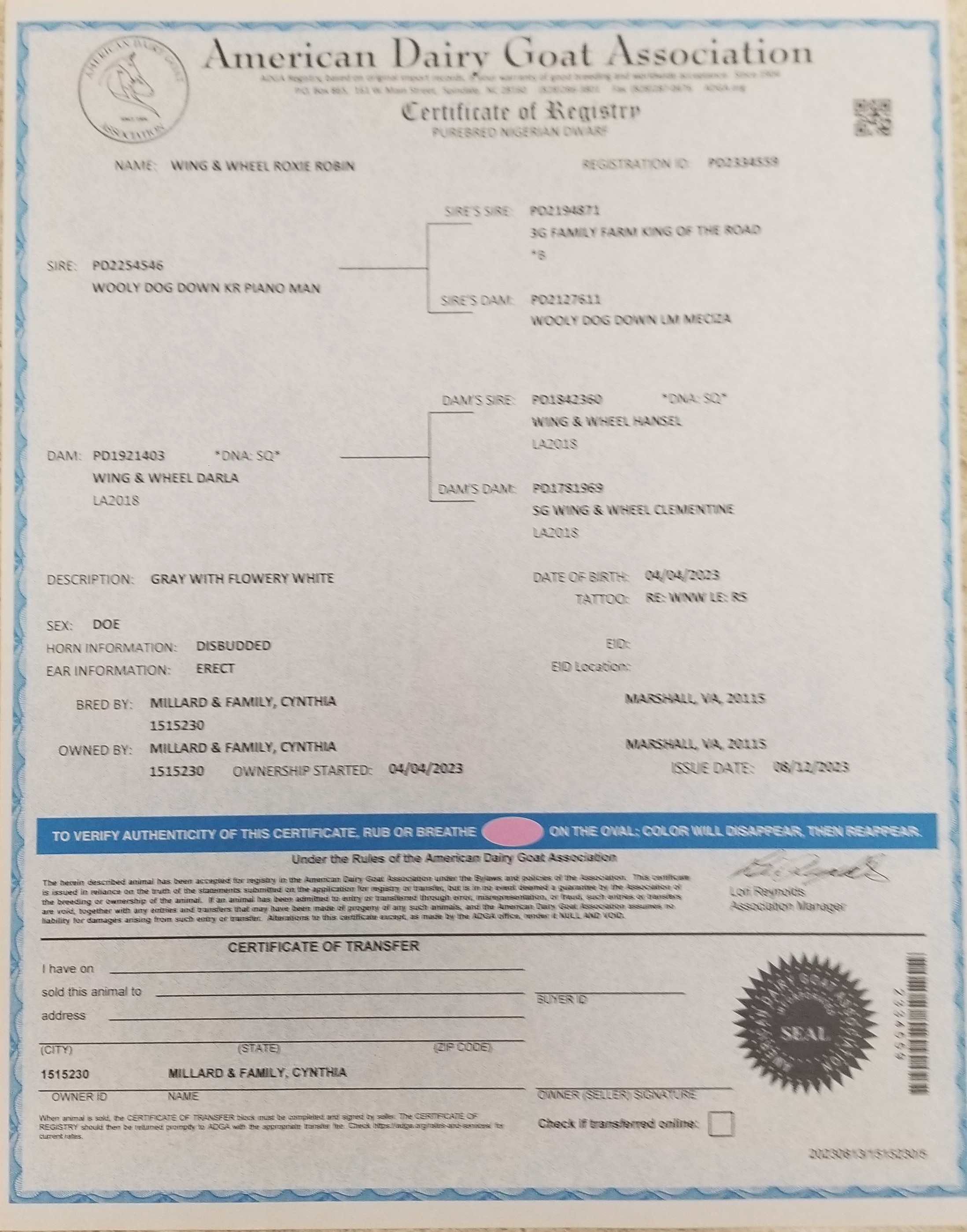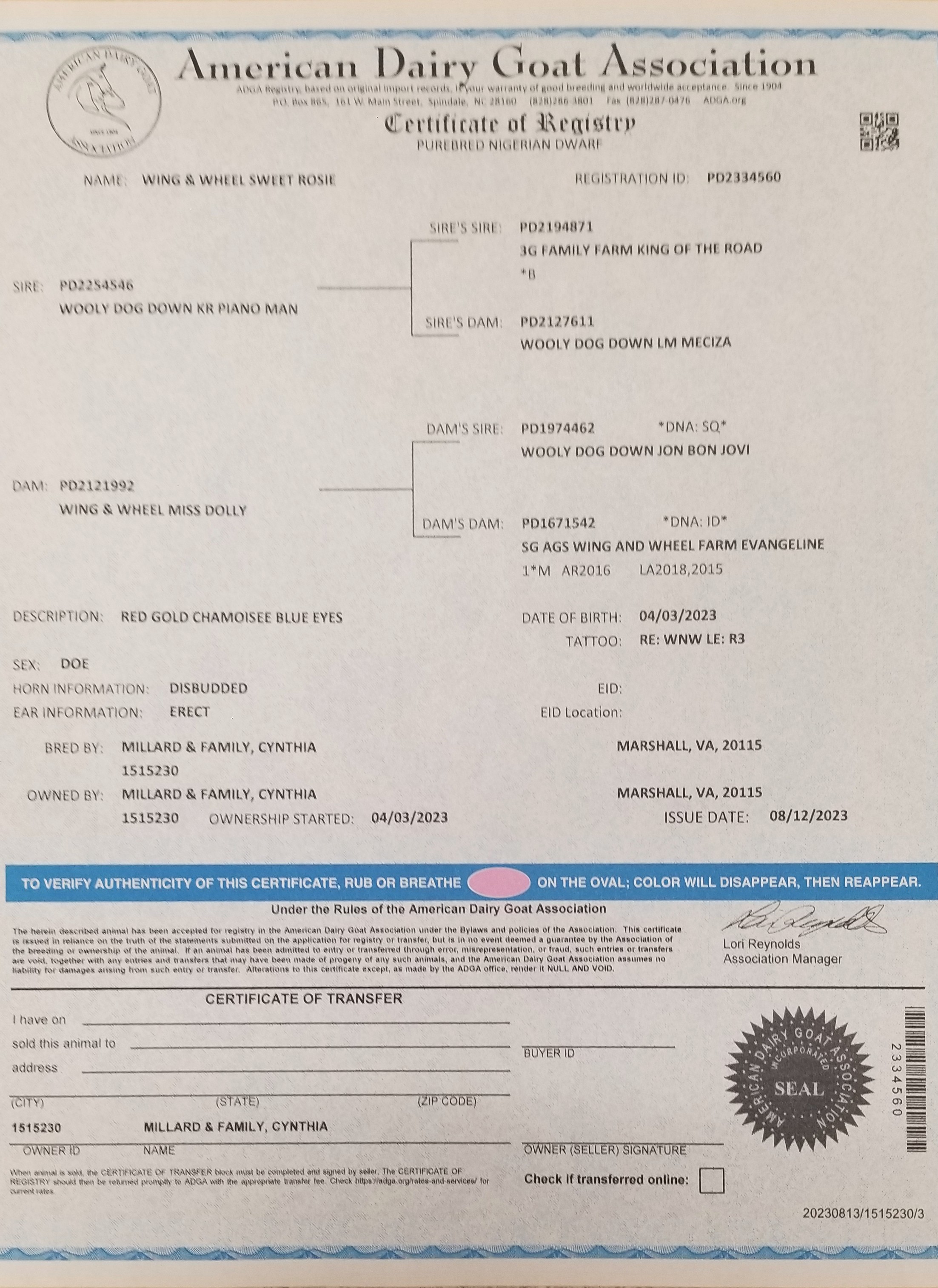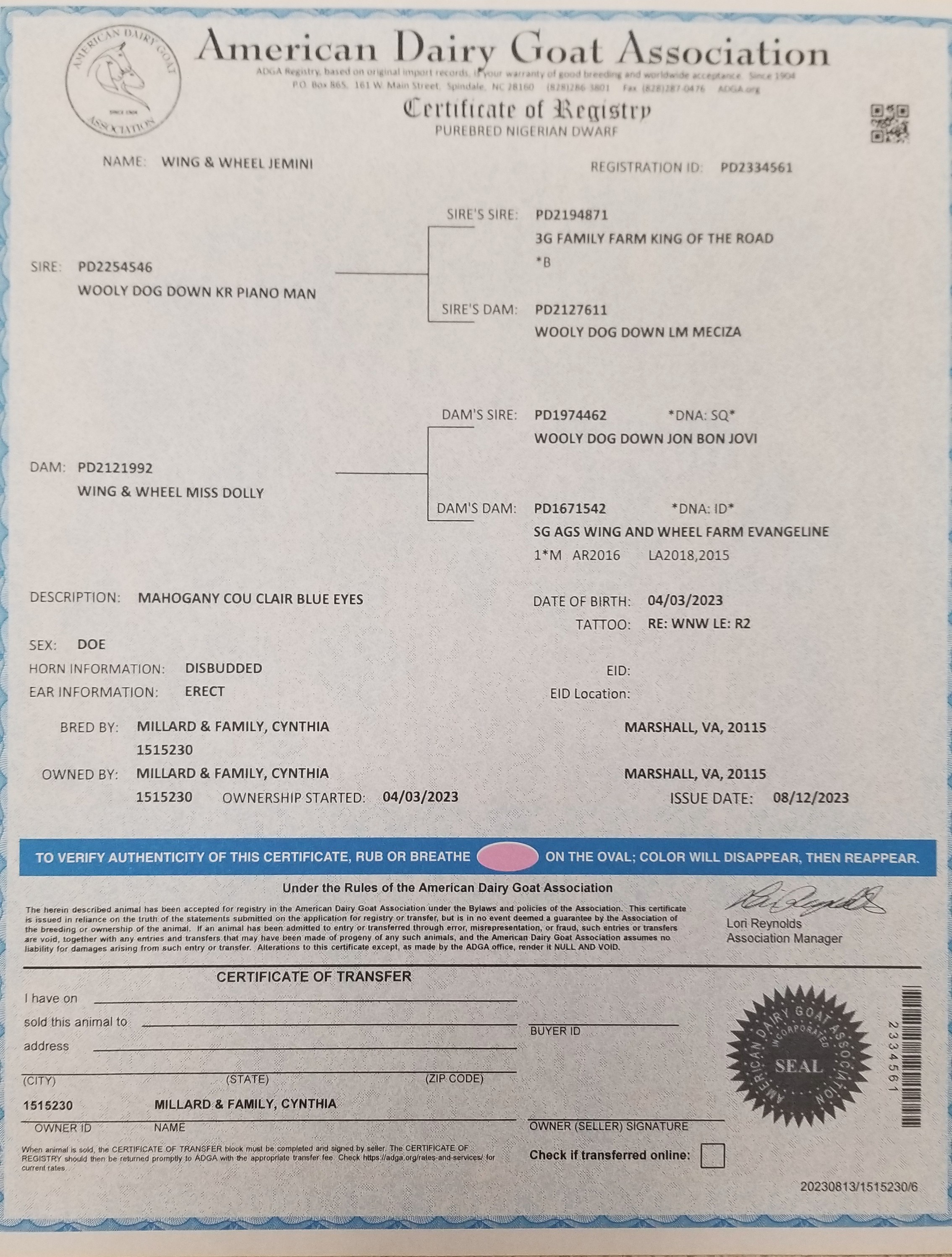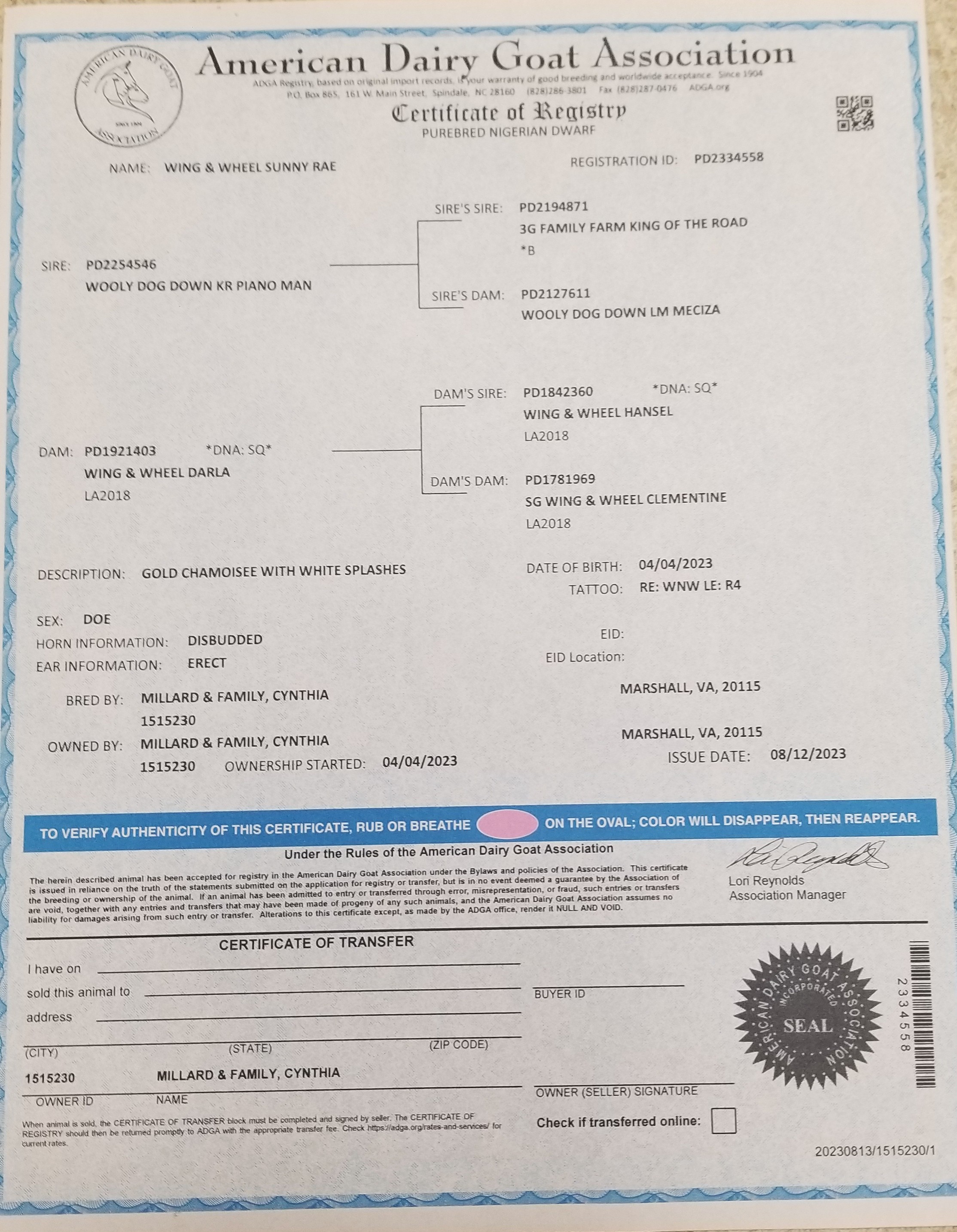Dam: Wing & Wheel Grettal ADGA# D1842359 1*M
